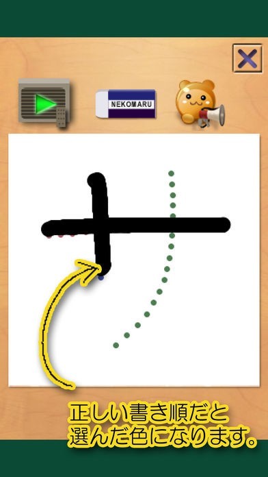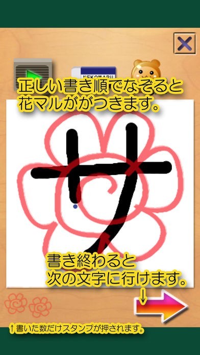 子供たちが苦手とするカタカナの書き順を丁寧に教えます。間違った書き順で書くと字が赤くなるので、すぐにお知らせします。きれいに正しい書き順でかけたときは大きな花まるが付くので、モチベーションが上がります。