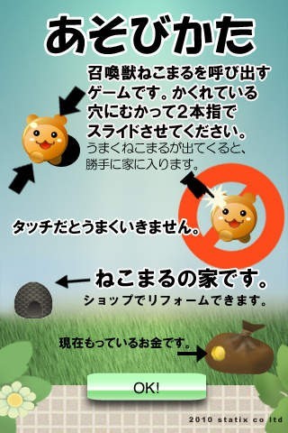 「ねこまる無料版」は、可愛い召喚獣「ねこまる」をつまんで遊ぶカジュアルゲームです。 穴の中に隠れているねこまるを探し出し、2本の指でつまむように引き上げましょう。 上手につまみ上げることができれば、お家に入って町の住人になってくれます。 ステージクリア状況により、金銀銅のランクが付くのも楽しいポイント。 最高ランクの獲得を目指してみてはいかがでしょうか。 町の育成機能も用意されており、家のアップグレードなどが可能。 ステージをクリアし、住人を増やせば、町をどんどん大きくしていくことができます。