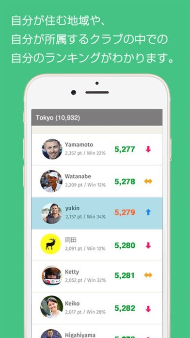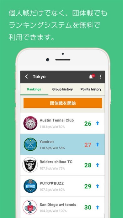 クラブ内ランキング、地域ランキングでは、自分のテニスのランキングだけでなく、友人のランキングもスマートフォンから知ることができ、友人同士で競うこともできます。
