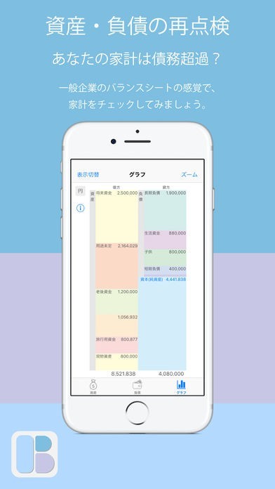 家庭の出費をバランスシート形式で管理できる家計簿アプリ