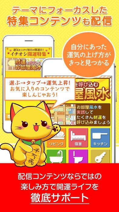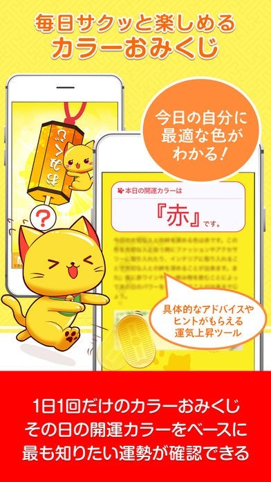 おみくじ機能があります。1日1回、金色のネコと一緒におみくじを引くと、その日のラッキーカラーを知ることができます。カラーとアドバイスがあります。参考になり、意識して生活をすると運勢を上げていくことができます。