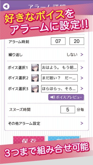 アラームに使うボイスを3つまで選んでセットすることができます。ボイスプレビューでボイスを実際に聞いてみてから選べ、3種類のセリフを組み合わせることでオリジナルのセリフを作れます。