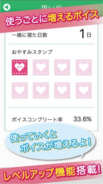 アプリを使うほどレベルアップしていき、使えるボイスが増えていきます。一緒に寝た日数はおやすみスタンプで記録されて、ボイスコンプリート率も表示されるので100%を目指せます。