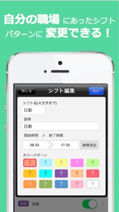夜勤や日勤などの勤務体系もあらかじめ登録しておけばスタンプのように張り付けることができる!