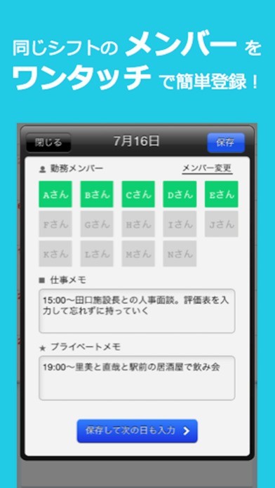 ・ダイアログ下部にある「保存して次の日へ」のボタンを押すと、連続して次の日のメンバー、メモを入力できます。