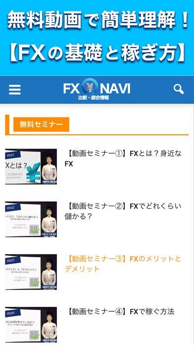 アプリにはFXで稼ぐ方法を教えてくれる動画サービスが付いています。FXのメリット&デメリット、稼げる額など、気になる情報が満載です。プロの分かりやすい解説は必見です。