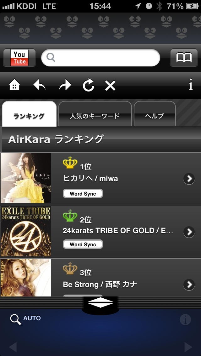 "AirKara"は、歌詞をインターネット上で検索して、同時に動画を再生することが可能なブラウザアプリとなっています。本アプリの特徴的な機能として、歌詞をダブルタップする事で、曲調に合わせて歌詞が自動スクロールする機能を搭載している点にあります。また、歌詞単体検索機能により、虫眼鏡のマークをタップすれば、突然耳にした曲をとっさに調べる事が可能です。さらに、ランキング機能では話題の曲や流行りの曲を見逃さずに聴くことができ大変便利です。このように多彩な機能が満載で、スマホひとつで、まるでPVカラオケをしている様な感覚になれる魅力のアプリです。