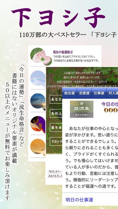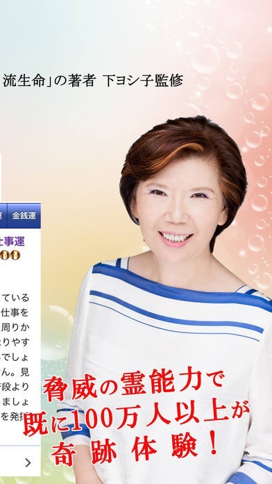 霊能力者『下ヨシ子』監修の独自の福運術『流生命』で、毎日の生活に必要なアドバイスを貰っています。