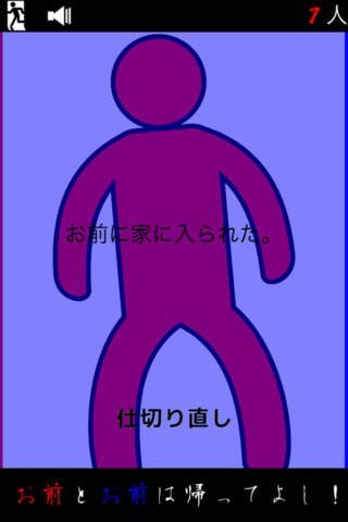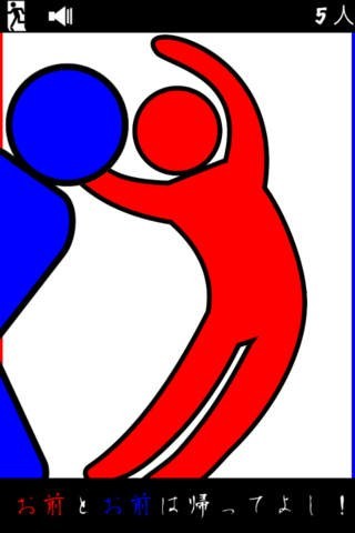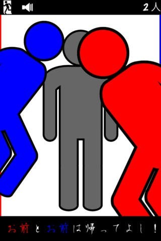 「お前とお前は帰ってよし!」はギャグ要素のあるゲームです。舞台はホームパーティーですが、呼んでもいない「お前」が次々に訪ねてきます。その邪魔者を左右にスライドして追い返していくゲームです。人物は棒人間の姿となっていて、邪魔者は赤と青で表示されています。正式な客人はグレーで表示されているので、客人だけを家に招き入れていきます。時間がたつにつれて邪魔者は増えてくるので、見つけたら即追い出していきましょう。だんだんとスピードが速くなってくるので素早くさばくのがスコアをあげるポイントです。邪魔者である「お前」が家に入るとゲームオーバーとなるので常に目を光らせてハイスコアを目指しましょう。