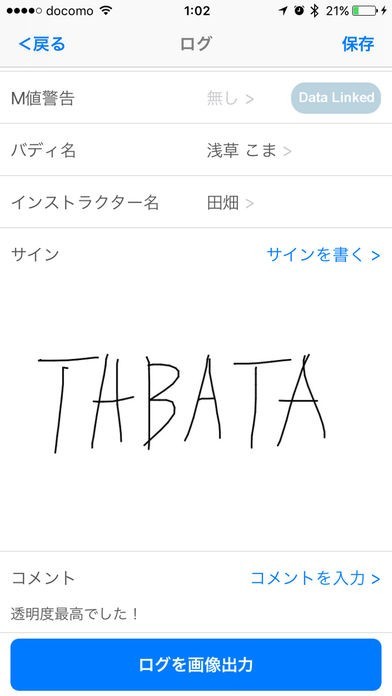 サインの手書き入力機能を搭載しています。インストラクターのサインを残すための機能となっており、入力画面に指先で描くだけでサインが可能。その場でサインをして貰いたい時にも素早く利用できます。
