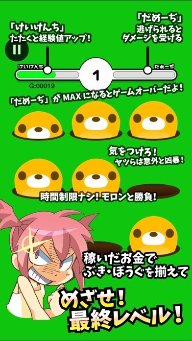 もぐらを叩くたびにゴールドを獲得できます。 ゴールドでより強力な武器・防具を装備しよう。レベルが上がると獲得金額もアップ。未知の金属「オリハルコン」を入手せよ!