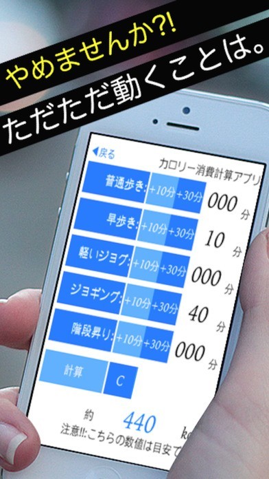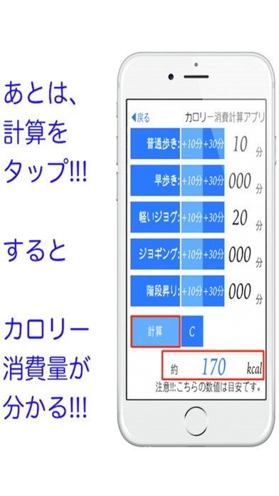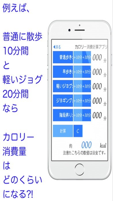 App Storeより引用散歩や早歩き、歩いジョグ、ジョギング、階段昇りのカロリー消費を