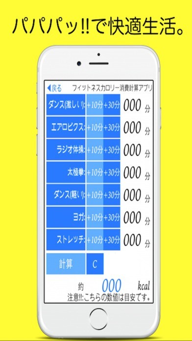 複数の運動の計算に対応しており、1つの表示画面ですべての計算が終わります。運動した時間を入力していくだけで、トータルで消費したカロリーがわかるので、いちいち計算する手間がありません。