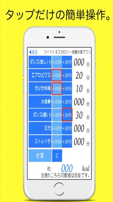 ストレッチやエアロビクスなど、ジムでの運動で消費されるカロリーがわかります。項目をタップするだけで良く、時間も10分単位で追加が可能。大まなか数値が簡単に計算できます。
