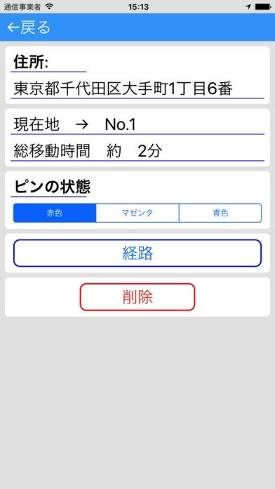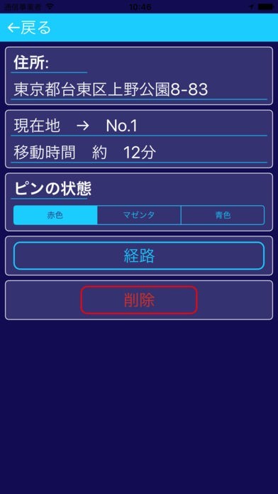 削除 ボタンをタップした場合は、選択しているピンが地図上から削除されます。