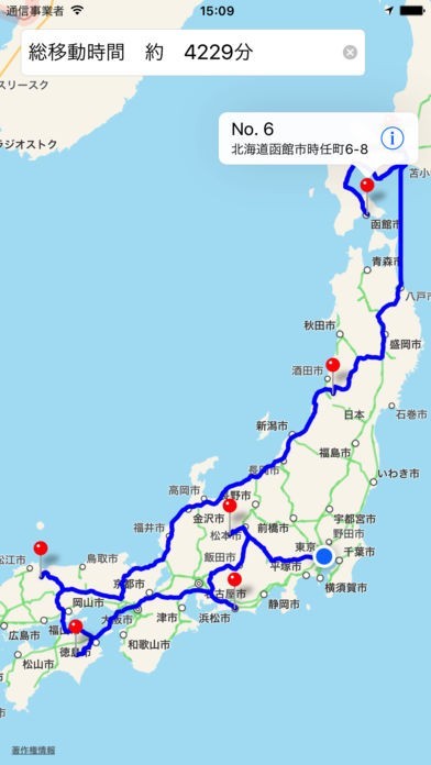 複数のピンを刺した場合は、目的地を回る順番が自動で入れ替わり、すべてのピンを最短で回る経路が表示されます。