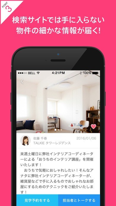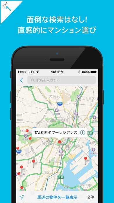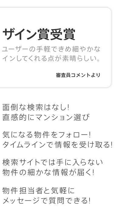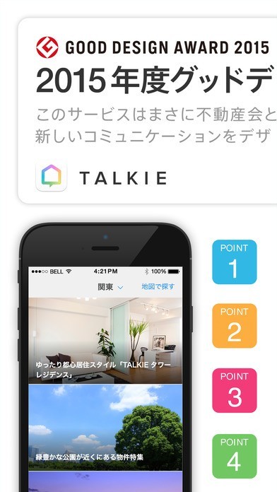 TALKIE(トーキー)新築・分譲マンションは、「不動産サイトでは理想的なマンションが見つからなかった」「マンションの購入を検討している」という社会人の人達は、目が離せないアプリです。ですから、賃貸を探している人は他のアプリをお勧めします。本アプリは、2015年にグッドデザイン賞を受賞したおしゃれさが魅力!それに見合ったおしゃれな物件が目白押しになっています。しかも、地図検索やタイムラインを使って物件をサクサクチェックできる手軽さです。気になった物件があったら「トーク機能」を使って、すぐにスタッフとやり取りできる手軽さも魅力的です。興味を持ったら見学の希望も出しちゃいましょう。