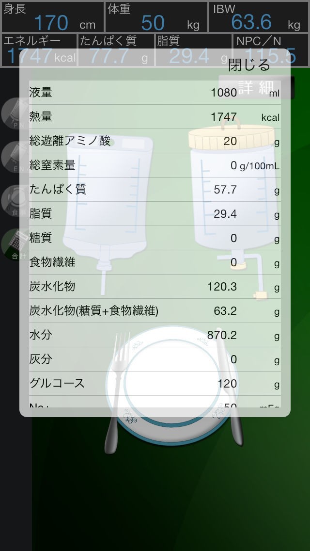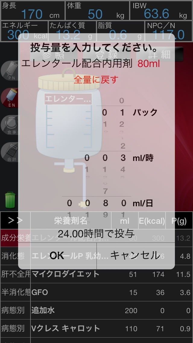 毎日カラダの中にいれるクスリや、食事で摂取する栄養素を記録して、患者の体調や、容態の変化を見ることができます。タンパク質や脂質、エネルギーの補給した量を確認できます。