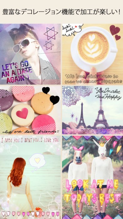 オシャレな女の子に大人気!全世界で450万人が利用しているカメラアプリです。 ビューティーモードで撮った美白写真や、写真フォルダの画像も画質を落とさずキレイに画像加工できます。 プリ機メーカープロデュースのスタンプやフレームなど、かわいいデコ素材がいっぱい。追加デコ素材も合わせると総アイテム数は3000種類以上に! 連携機能もバッチリ!ツイッターやインスタグラムにカンタンに投稿できます。 写真撮影してデコレーション、そしてSNSにアップまでこのアプリひとつでできちゃいます!