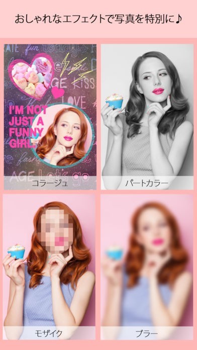 コラージュ機能で写真をかわいい形に切り取ったりその写真を一枚にまとめて簡単に思い出をまとめて見やすくすることができます。モザイクやパートカラーなど一部のみの加工も簡単に行えます