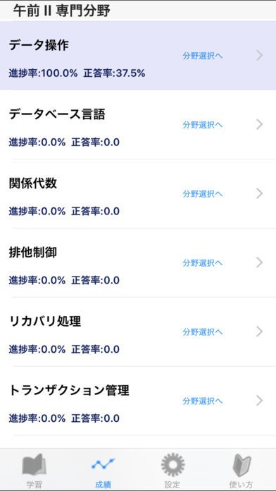学習進度を管理するための機能が充実しています。カテゴリや分野ごとに回答数や正解数を管理します。それに合わせた苦手問題、完璧問題などを使って弱点を克服することが可能です。自己を振り返って合格率を上げることができます。