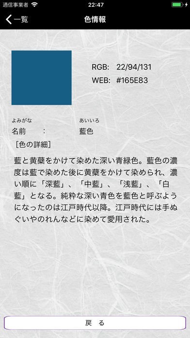 色を調べると詳細な説明が見られます。名前の由来や、どのような場面で使用されているかもわかるので、きちんとした知識として記憶に定着します。使い勝手が良く頼りになるアプリです。