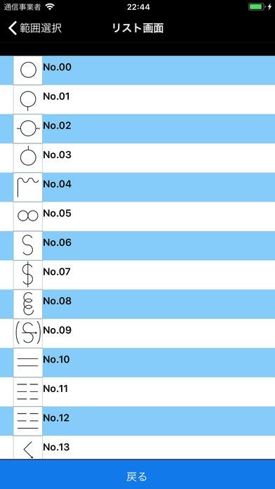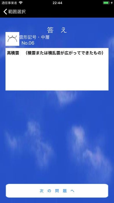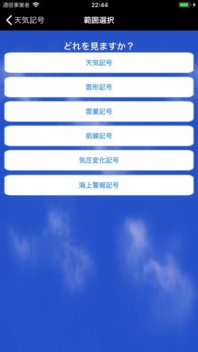 アプリには色んなタイプの記号が収録されています。範囲選択画面では、天気記号はもちろん雲形記号や前線記号など、試験に必要な記号から選ぶことができます。出題分野が分かれているので、苦手対策も立てやすくなります。