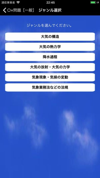 ジャンルごとに問題が収録されています。ジャンルは大気の構造、降水過程など、6種類に分かれています。自分の伸ばしたい分野、苦手を克服したい分野を選んで問題を解きましょう。