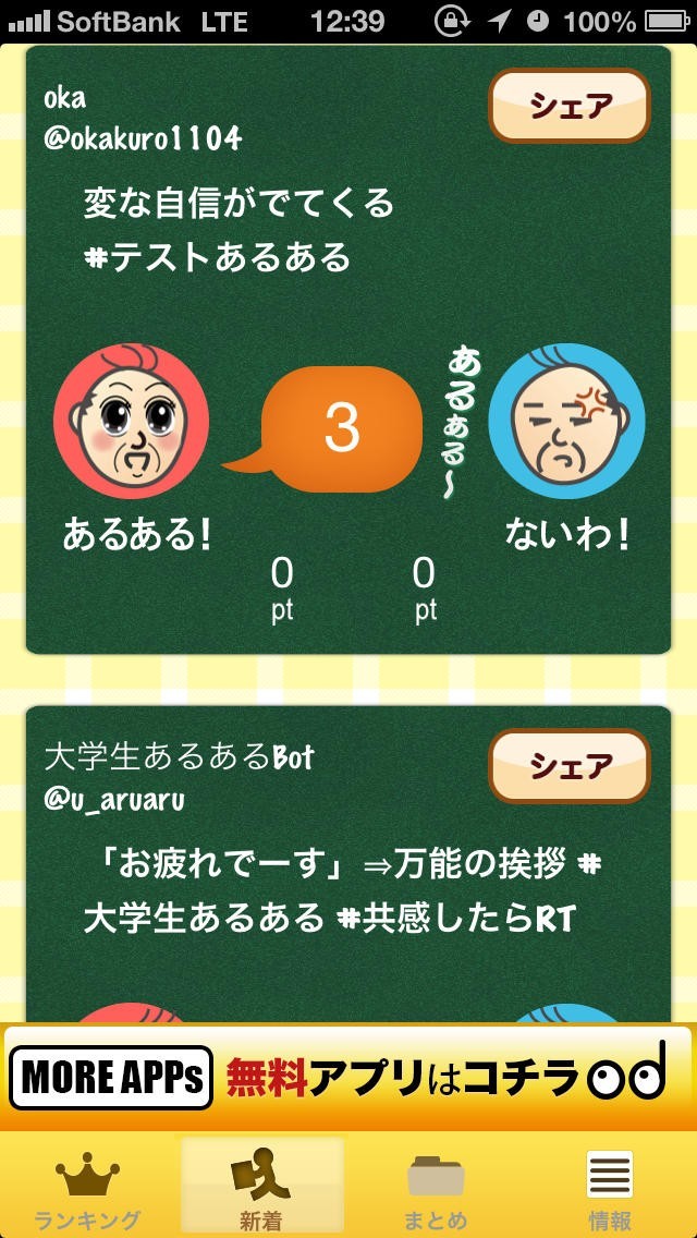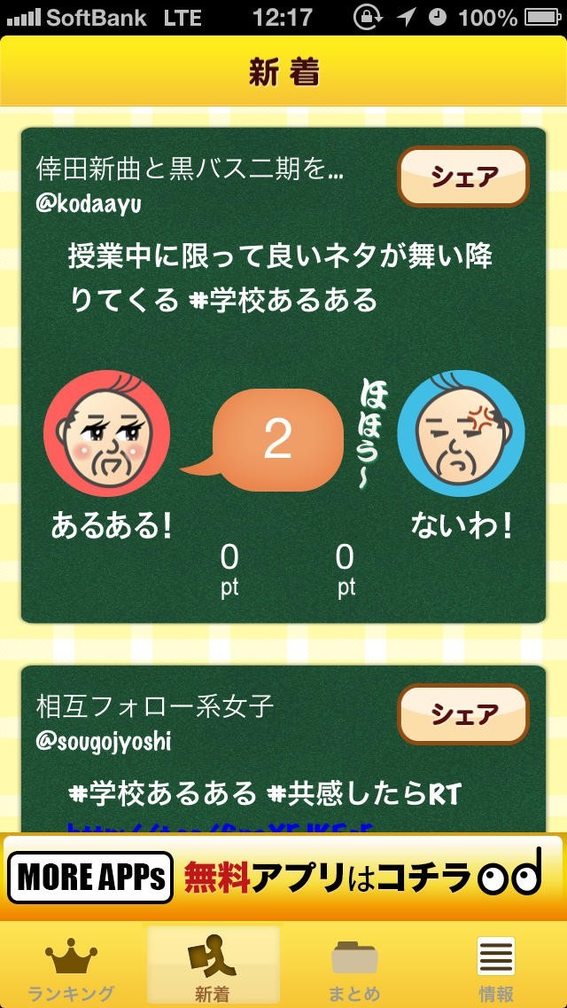 Twitterでつぶやかれた学校あるあるをまとめて見ることができ、「あるある!」、「ないわ!」とツッコミを入れることができるアプリです!