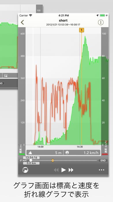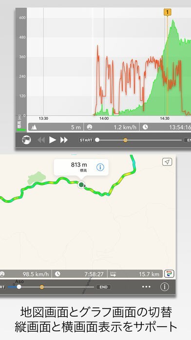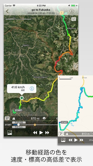 残しておいた記録は再生機能があるので走行した時の時間や速度などを地図上にアイコンで表示して再現してくれたり最高速度や平均速度などを見る事ができるので思い出したい便利です。