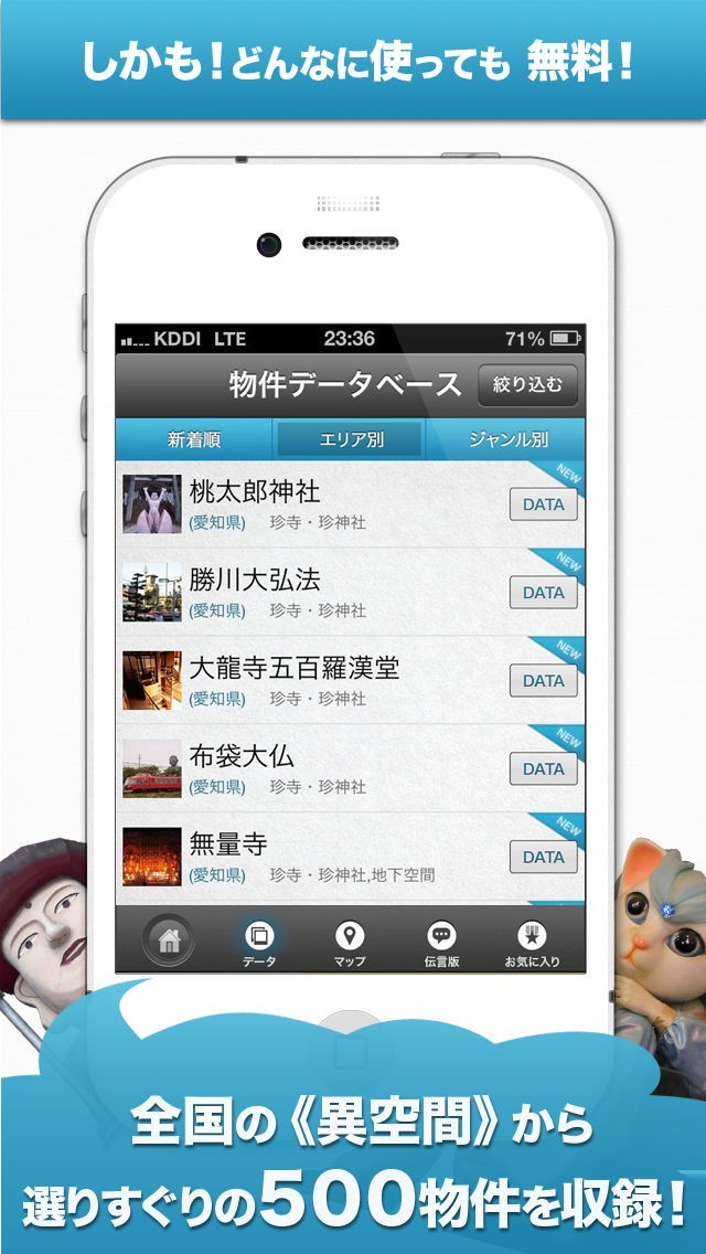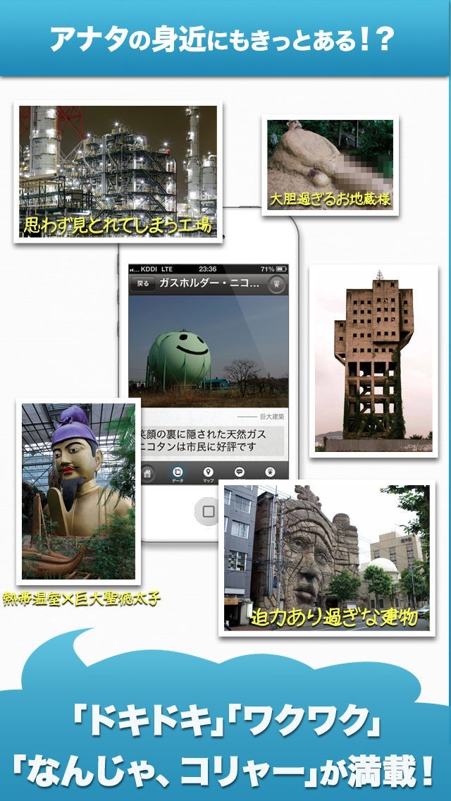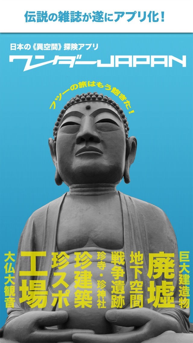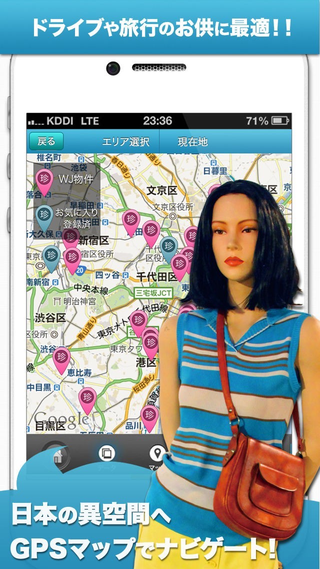 「ワンダーJAPAN」は異空間にスポットを当てたアプリで、物件データベースには500件以上の異空間を紹介してくれています。それらは少し変わっているけど興味深いようなものが多く、友人を誘って探検してみたりすることもできますし、一人旅の旅行先にも使えますし、インスタ映えするような面白くて目立つ写真も撮ることが出来ることでしょう。 これらの豊富な情報はすべて無料で見ることが出来、特に制限などもありません。 また、それらの場所は地図上にマークがついていること、GPSで道案内をしてくれることから迷うような心配もありません。 また、どんどんと毎月20件程度新たな場所を紹介してくれます。
