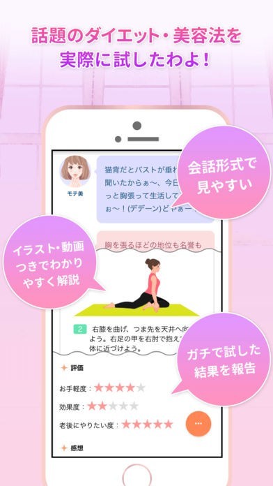 360万ダウンロードを達成している「MotecoBeauty」は、いろいろあるダイエット方法や美容法をひとつずつ試してみて、「お手軽度」、「効果度」、「老後にやりたい度」などというような評価基準で、5段階評価をしているので、試す前に参考にすることが出来るので、それらを実践する前にある程度の知識を得ることが可能となります。 加えて、感想などを会話形式でチェックできることから、文章が読みやすくなっていて、長文を読むのが苦手な方でも安心です。 さらには右上の星マークをタップすれば、あとから見返すことも出来るので、試してみようと思ったものに使用してみましょう。 他には、歩いた時間などを記録してくれるので、健康的になるための運動の後押しもしてくれます。