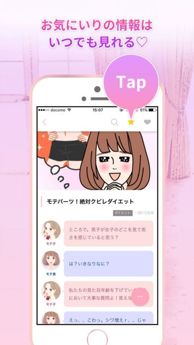 360万ダウンロードを達成している「MotecoBeauty」は、いろいろあるダイエット方法や美容法をひとつずつ試してみて、「お手軽度」、「効果度」、「老後にやりたい度」などというような評価基準で、5段階評価をしていて、試す前に参考にすることが出来るので、それらを実践する前にある程度の知識を得ることが可能となります。 よって、そのようなことに興味はあるけど失敗はしたくないというような主婦の方に向いています。 加えて、感想などを会話形式でチェックできることから、文章が読みやすくなっていて、長文を読むのが苦手というような方でも安心です。 さらには右上の星マークをタップすれば、「お気に入り登録」機能をつかえてあとから見返すことも出来るので、試してみようと思ったものに使用してみましょう。 他には、歩いた時間などを記録してくれるので、健康的になるための運動の後押しとして使えます。