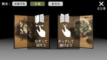 6種類の体験型コンテンツを収録しています。蒔絵の制作工程体験や、屏風の表裏体験などが可能。画面に表示された屏風を指先でスワイプすることで、表裏の差を体験できるようになっています。