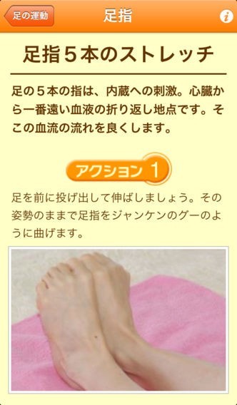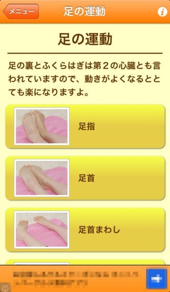 椅子に座った状態でのストレッチなど、小さな動きで効果を発揮するトレーニングが足・手・体のパーツ別に登録されている。