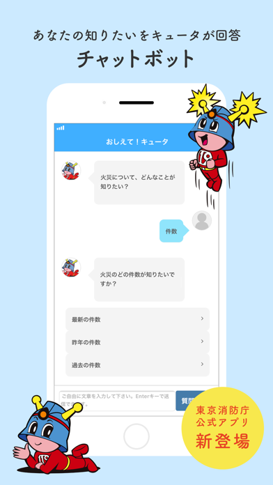 災害情報は逐一更新され、最新の情報を入手できます。安否確認や緊急ブザーなど、非常事態に対応した機能もあります。わからないことがあれば、チャットボットでキュータに質問をすると答えてくれます。