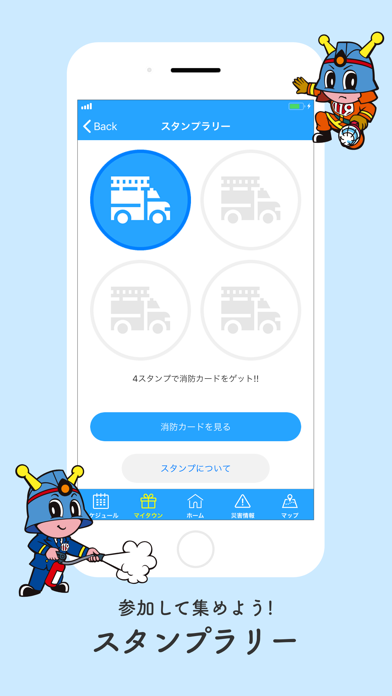 スタンプラリーでは、イベント参加後のアンケートに答えてスタンプをGET。4つ集めると消防カードが手に入ります。その他、消防クイズやパズルなど、子供と一緒に参加出来るコンテンツが揃っています。