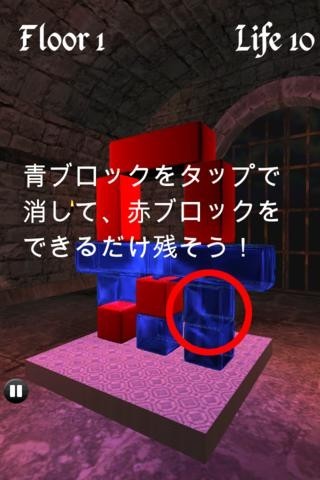 フロアに用意された青ブロックをタップで消して、できるだけ赤ブロックを残してください。