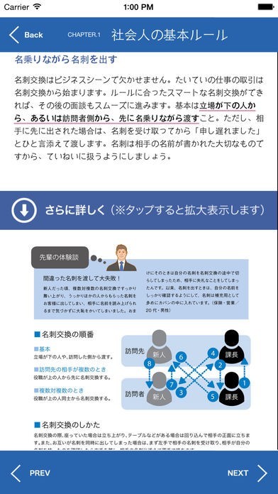 このアプリでは、おさえておきたい基本のビジネスマナーから、「できる人」になれる仕事術まで、徹底紹介。名刺交換や接待のルール、冠婚葬祭の基本マナーなど、社会人の常識をわかりやすく解説しています。新入社員の方はもちろん、そうでない方でも必ず役立つアプリです。
