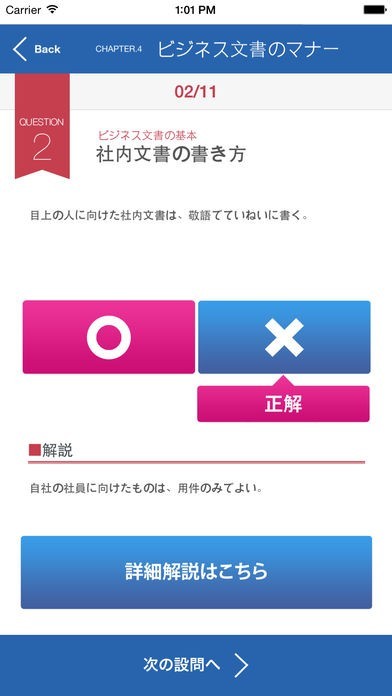 1問ごとに正解と、詳細解説へのリンクが表示されます。分からないところは、詳細解説を利用して復習してください。