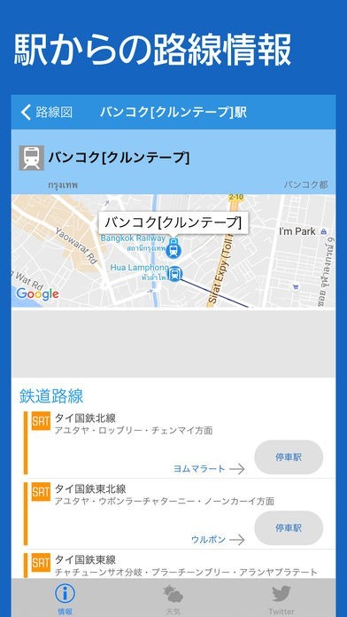 「タイ路線図–バンコク・タイ王国全土」はタイの鉄道経路を見ることができるので旅行者や滞在者には嬉しいアプリです。 タイの国鉄(SRT)やバンコク地下鉄MRTやBTS、また空港からの鉄道経路が網羅されています。駅名や駅の番号による検索も可能なので、タイ語や英語の読み方がわからなくても自分の行きたい場所を探すことができます。 もちろん乗り換え案内もしてくれるので、鉄道を使った観光やバンコク市内を移動する際にとても役に立ちます。 また駅周辺の天気の情報や写真も見ることができるので、お出かけ前に確認できるもの便利ですね。