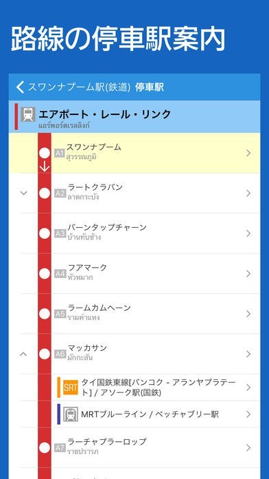 海外旅行に行った時、現地の言葉や英語で書かれた駅名って読みづらかったりどう発音していいのかわからないことってありますよね。このアプリでは全て日本語・カタカナ表記になっているので駅名が一目瞭然です。タイ語の表記もあるので、現地の人に聞く時にも聞きやすいですね。