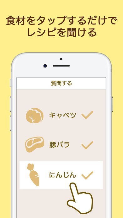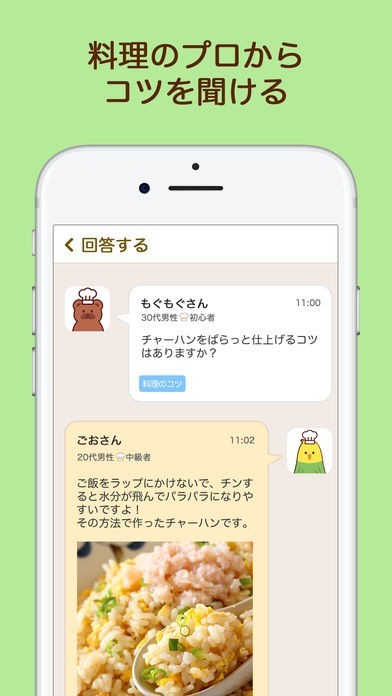 レシピについてチャットで質問すると180秒程度で返信してくれます。いまある食材をタップすればオススメの料理を示してくれることから、とても簡単に晩御飯を決定することが出来ますし、さらに健康的にも気をつかったものを提案してくれます。 また、料理の写真がとても大きいことから、どのようなものなのかを作る前にしっかりと把握することも出来ますし、イメージしやすいです。 他にもコツなど材料の羅列だけではなかなか解らない情報も知ることができ、「回答する」によって他の方の困った事態を助けるお手伝いをすることが出来るので、豊富な知識を持っているような方はそれを存分に活かしてランキング上位を目指してみるのもいいでしょう。 また、過去のものを上部をタップすれば閲覧できるので、もう一度見たくなった要な場合には役に立ちます。