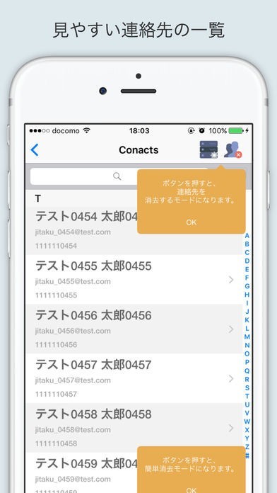 アプリ内での連絡先の削除、編集、閲覧操作のみにアクセス権限を使用しますので、ご安心してお使い下さい。