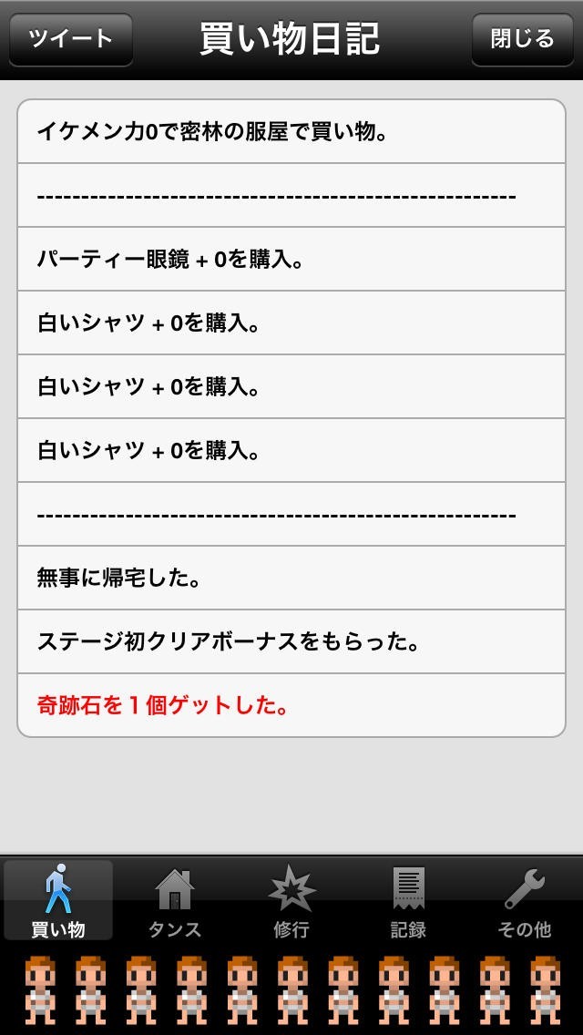 ある日、引きこもりのたかしくんにお母さんから手紙が。 自分に自信がないのならかっこいい服を買ってくるのもいいかも、と勧めるお母さんの言葉を聞いて、たかしくんはお店(=ダンジョン)に服を買いに行くことにします。 かっこいい服を手に入れ、強化でイケメン力を磨いて、脱引きこもりを目指す放置型ロールプレイングゲームです。 たかしくんはスキルを使う事もでき、うまく利用することでお店を攻略できるかもしれません。 果たしてたかしくんはイケメンになって脱引きこもりできるのか?ラストのストーリーが気になります。