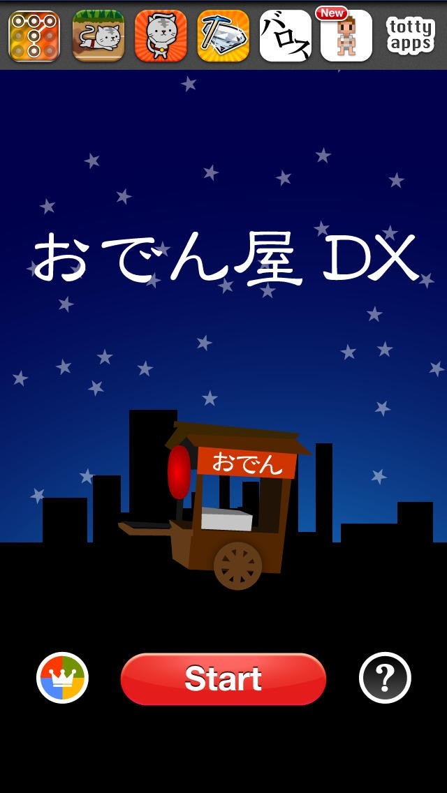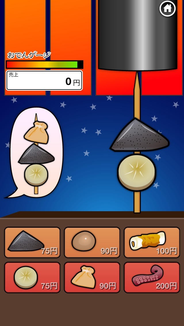 寒い季節にぴったりのゲーム「おでん屋DX」 おでん屋の親父から要望が出された通りのおでんの具を串に刺してお客さんに提供するシンプルなゲームです。 おでんの具は一本の串について3種類あり、間違ったおでんを作ってしまうと完成とはなりません。完成したおでんの数を制限時間の中で競い合うタイムアタック形式のハラハラするゲームとなっています。正確性を意識しつつも、スピードに関してもこだわらなくてはいけないため、ハイスコアを記録するのは至難の業です。