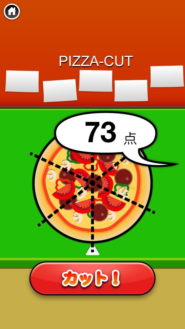 5枚のピザをスライド操作で正確にカットすることで高得点を狙う!