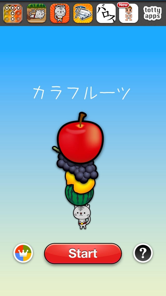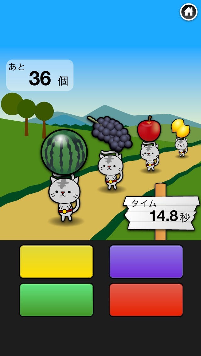 可愛いネコが運んでくるフルーツと同じ色のボタンをタップするシンプルなルール、タイムを競いながら子供から大人まで楽しめる
