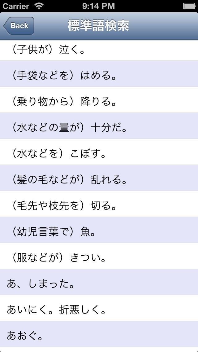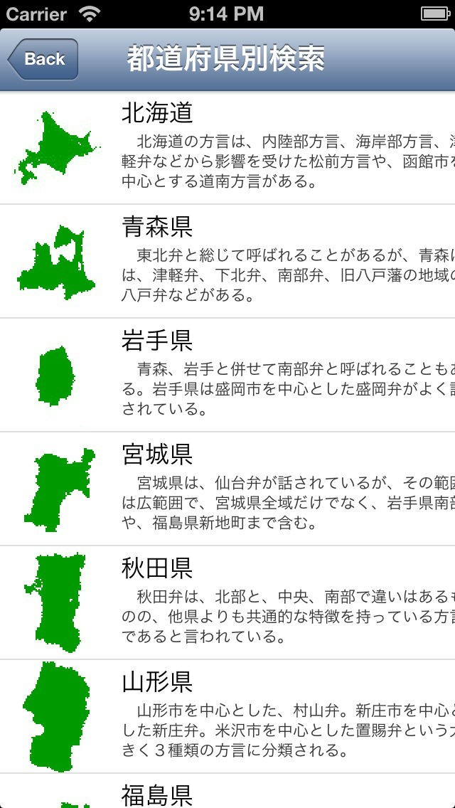 この方言辞典のアプリは、2通りの検索方法があります。まず1つに、都道府県別の検索です。都道府県を選択すると、その土地で使われている方言が一覧で出てくるため、自分が調べたい場所ごとの検索ができます。2つめに、標準語からの検索があります。こちらは標準語の言葉を選択すると、それと同じ意味の都道府県ごとの方言が表示されるのです。この土地はこんな言い方をするんだ、と楽しく方言を調べることが出来ます