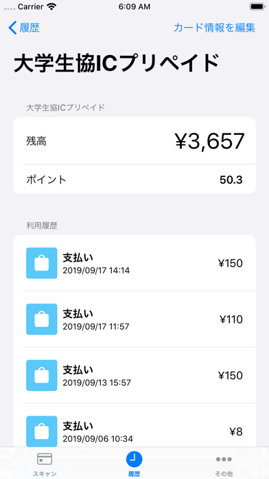 カードの読み取りに対応していないデバイスの場合は、他の対応デバイスで読み取ったカードの情報(履歴)を iCloud 経由で確認することができます。